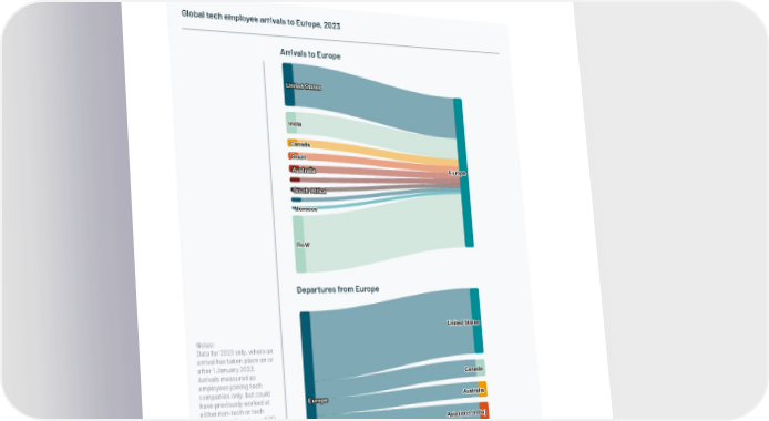 The movement of talent across borders Europe is a net bene昀椀ciary of talent 昀氀ows, attracting new starters from across the globe. That means we’re gaining more international talent than we’re losing. Notably, more talent is moving from the US to work in European tech than European talent is moving to join the US tech scene. It really illustrates the pull our companies now have. In fact, Europe is a net gainer from essentially every single region, apart from Australia. Global tech employee arrivals to Europe, 2023 Arrivals to Europe UUUnnniiittteeeddd SSStttaaattteeesss IInnddiiaa India CCaannaaddaa Canada BBrraazziill Brazil EEuurrooppee AAuussttrraalliiaa Europe Australia SSoouutthh AAffrriiccaa South Africa Morocco MMoorrooccccoo RoW RRooWW Departures from Europe UUUnnniiittteeeddd SSStttaaattteeesss Notes: Data for 2023 only, where an arrival has taken place on or after 1 January 2023. Arrivals measured as CCCaaannnaaadddaaa employees joining tech companies only, but could have previously worked at EEEuuurrrooopppeee AAAuuussstttrrraaallliiiaaa either non-tech or tech companies. Data is as of 20 Asia (excl. India) September 2023. AAssiiaa ((eexxccll.. IInnddiiaa)) India Sources: IInnddiiaa UUUnnniiittteeeddd AAArrraaabbb EEEmmmiiirrraaattteeesss Powered by BBBrrraaazzziiilll RRooWW RoW | 46