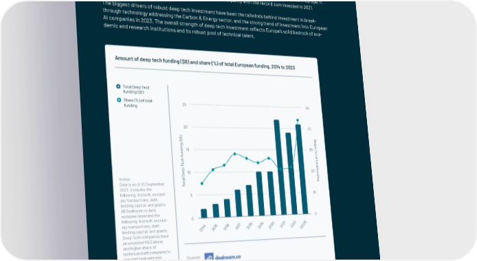 Continued innovation in deep tech The share of investment allocated to European deep tech companies - an umbrella category for companies that apply breakthroughs in science and engineering to come up with novel products and services - reached a record-breaking 44% of total capital invested in 2023, up from just 15% of total investment volume a decade ago. Deep tech investment has, in fact, bucked the overall slowdown in absolute investment volumes in Europe. It looks set to surpass last year’s total, and is coming close to parity with the record sum invested in 2021. The biggest drivers of robust deep tech investment have been the tailwinds behind investment in break- through technology addressing the Carbon & Energy sector, and the strong trend of investment into European AI companies in 2023. The overall strength of deep tech investment re昀氀ects Europe’s solid bedrock of aca- demic and research institutions and its robust pool of technical talent. Amount of deep tech funding ($B) and share (%) of total European funding, 2014 to 2023 Total Deep Tech funding ($B) Share (%) of total 25 50 funding 20 40 ) S B h $ ( a r g e n i ( d 15 30 % n ) u f o f h t c o e t T a l p f e u e 10 20 n D d i Notes: l n a g t Data is as of 30 September o 2023. Excludes the T following: biotech, second- 5 10 ary transactions, debt, lending capital, and grants. All Dealroom.co data excludes Israel and the following: biotech, second- 0 0 ary transactions, debt, 7 1 4 5 6 1 8 9 0 2 E 1 1 1 0 1 1 2 2 2 3 lending capital, and grants. 0 20 20 2 20 20 0 20 0 2 Deep Tech companies have 2 2 2 20 an extended R&D phase and higher share of technical staff compared to conventional ventures. Sources: Deep Tech also often involves the development of hardware and/or IP. | 138