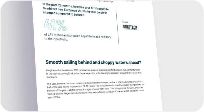 Appetite to add new European VC GPs remains strong As well as asking LPs to comment on their overall appetite to invest in European venture, the survey also asked respondents to speci昀椀cally state any change in their appetite to add net new managers to expand their portfolio of European VC funds. Almost half of all LP respondents (41%) stated an increased appetite to add new managers, while more than a third (41%) reported no change. Just 18% of LP respondents reported a decreased appetite to make commitments to new fund manager relationships. In the past 12 months, how has your 昀椀rm’s appetite to add net new European VC GPs to your portfolio changed compared to before? 41% Source of LPs stated an increased appetite to add new GPs to their portfolio. Smooth sailing behind and choppy waters ahead? Despite market headwinds, 2022 represented a record-breaking year for European VCs with funds raised in the year exceeding $24B, driven by an expansion of fundraising by both early-stage and later-stage fund managers. This year, however, looks set to record a meaningful year-on-year decline in total funds raised, with the 昀椀rst half of the year having recorded just $8.3B raised. The contraction in fundraising volumes during the 昀椀rst six months of the year is visible across all stages of investment focus. This falling number, however, should be framed within a longer-term perspective. Only a decade ago, European VCs raised just $5.1 billion for the full year of 2014. 195 | Fundraising