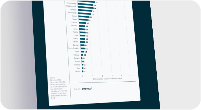 Count of current $B+ companies per 1M inhabitants Estonia 4.5 Sweden 2.4 Switzerland 2.2 Norway 2.1 Malta 2.0 Ireland 1.8 Luxembourg 1.6 United Kingdom 1.6 Denmark 1.4 Netherlands 1.3 Cyprus 1.1 Finland 0.9 Lithuania 0.7 Germany 0.6 France 0.6 Austria 0.6 Latvia 0.5 Croatia 0.5 Slovenia 0.5 Belgium 0.4 Czech Republic 0.4 Spain 0.3 Portugal 0.2 Bulgaria 0.1 Poland 0.1 Romania 0.1 Italy 0.1 Ukraine 0.1 Notes: 0 1 2 3 4 5 Data is as of 30 # of current $B+ companies per 1M inhabitants September 2023. '$B+' or 'unicorn' is deļ¬ned as a tech company that has reached $1B+ Sources: valuation in its lifetime. Population data from International Monetary Fund. | 124
