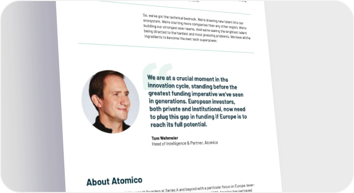 Of course, AI is not the only sector where Europe has continued to perform, as the region continues to show dedication to solving humanity’s toughest challenges. The Carbon & Energy sector, which encompasses ‘climate tech’, accounts for 30% of all capital invested in European tech in 2023, tripling its share of total investment since 2021. This made it the single largest sector by capital raised, overtaking both 昀椀ntech and software. It’s encouraging to see capital 昀氀owing to companies solving the world’s most crucial challeng- es, despite di昀케cult market conditions. So, we’ve got the technical bedrock. We’re drawing new talent into our ecosystem. We’re starting more companies than any other region. We’re building our strongest ever teams. And we’re seeing the brightest talent being directed to the hardest and most pressing problems. We have all the ingredients to become the next tech superpower. We are at a crucial moment in the innovation cycle, standing before the greatest funding imperative we’ve seen in generations. European investors, both private and institutional, now need to plug this gap in funding if Europe is to reach its full potential. Tom Wehmeier Head of Intelligence & Partner, Atomico About Atomico Atomico invests in ambitious tech founders at Series A and beyond with a particular focus on Europe, lever- aging deep operational experience to supercharge their growth. Founded in 2006, Atomico has partnered with over 100 ambitious teams - including those at Klarna, Supercell, Graphcore, Compass, MessageBird, Masterclass, Attentive Mobile, Pipedrive and Hinge Health. Atomico’s team of founders, investors and opera- tional leaders have been responsible for global expansion, hiring and marketing at companies from Skype and Google to Twitter and Uber. 9 | A word from...