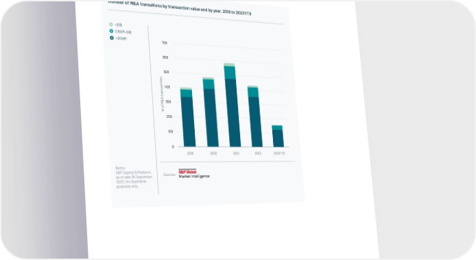 Small but mighty sub $100M mergers Across all transaction value brackets, 2023 registered a signi昀椀cant decline in the number of M&A transac- tions. Billion-dollar acquisitions may dominate the headlines, but they do not dominate overall M&A activity by volume. In fact, billion-dollar acquisitions typically only account for a low single-digit share of all M&A transac- tions in any given year. In 2023, billion-dollar acquisitions made up just 3% of M&A activity in the year to date. As in every other year, the vast majority (77%) of M&A transactions in 2023 were sized at less than $100M. Number of M&A transations by transaction value and by year, 2019 to 2023YTD >$1B $100M-$1B