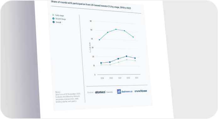 US investor participation down In Europe, shifting global capital 昀氀ows have led to less investment from US investors in both early and late- stage funding rounds. Despite the drop in investment stages, US investor participation in European funding rounds is still higher than historical norms. Many long-term US investors continue to be actively involved in the region. Share of rounds with participation from US-based investor (%) by stage, 2019 to 2023 Early stage Growth Stage 60 Overall 50 40 s l a e d l l30 a f o % 20 10 0 2019 2020 2021 2022 2023 Notes: Sources: Data is as of 30 September 2023. Powered by Excludes the following: biotech, secondary transactions, debt, lending capital, and grants. | 26