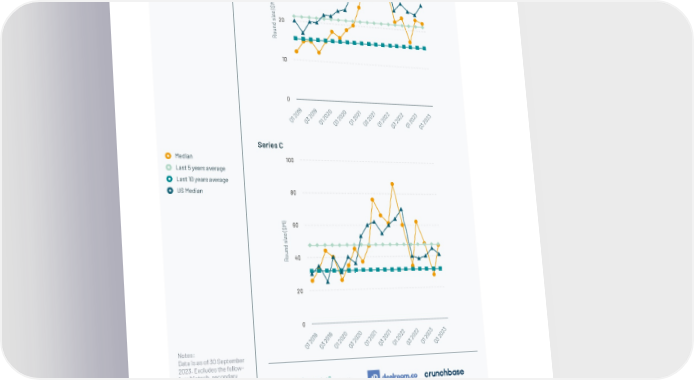 Series B Median Last 5 years average 40 Last 10 years average US Median 30 ) M $ ( e z i s 20 d n u o R 10 0 9 9 0 0 1 1 2 2 3 3 1 1 2 2 2 2 2 2 2 2 0 0 0 0 0 0 0 0 0 0 2 2 2 2 2 2 2 2 2 2 1 3 1 3 Q Q Q1 3 Q Q Q1 3 Q1 3 Q Q Q Series C Median 100 Last 5 years average Last 10 years average US Median 80 ) M 60 $ ( e z i s d n u o 40 R 20 0 9 9 0 0 1 1 2 2 3 3 1 1 2 2 2 2 2 2 2 2 0 0 0 0 0 0 0 0 0 0 2 2 2 2 2 2 2 2 2 2 Q1 3 1 3 1 3 1 3 1 3 Notes: Q Q Q Q Q Q Q Q Q Data is as of 30 September 2023. Excludes the follow- ing: biotech, secondary transactions, debt, lending Sources: Powered by capital, and grants. | 44