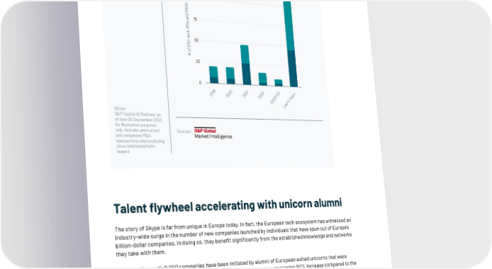 Count of $1B+ European tech IPOs and M&As, 2019 to 2023 M&A IPO 125 100 s A & M d n 75 a s O P I h c e t + 50 B 1 $ f o # 25 0 9 0 1 2 D s 1 2 2 2 T r 0 0 0 0 Y a 2 2 2 2 3 e 2 Y 20 t 5 Las Notes: S&P Capital IQ Platform, as of date 30 September 2023, for illustrative purposes only. Includes announced Sources: and completed M&A transactions only (excluding since terminated/with- drawn). Talent 昀氀ywheel accelerating with unicorn alumni The story of Skype is far from unique in Europe today. In fact, the European tech ecosystem has witnessed an industry-wide surge in the number of new companies launched by individuals that have spun out of Europe’s billion-dollar companies. In doing so, they bene昀椀t signi昀椀cantly from the established knowledge and networks they take with them. Remarkably, nearly 9,000 companies have been initiated by alumni of European exited unicorns that were founded during the 2000s. To put this into perspective, it is nearly a staggering 50% increase compared to the unicorns founded in the 1990s. It is not di昀케cult to imagine how this network effect will signi昀椀cantly in昀氀uence Europe’s path in the next ten years. 63 | Executive summary