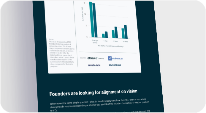 Early stage funnel for 2018 cohort of companies, Europe vs United States Europe United States 20 15 ) 0 0 0 ' ( s p u 10 t r a t s f o # 5 0 Notes: Startups +1 Year +3 Years +5 Years Data as of 20 September 2023. formed Based on historical analysis of # of startups funded (years post funding) conversion rates: 15% of Seed stage companies convert to Series A on average and 33% of Series A convert to Series B (for the majority of those converting, it takes place within 2 years); these Sources: Powered by rates have been applied to the current cohort of Seed and Early stage companies for illustrative purposes. Founders are looking for alignment on vision When asked the same simple question - what do founders really want from their VCs - there is a surprising divergence in responses depending on whether you ask this of the founders themselves, or whether you put it to VCs. While VC respondents are most likely to cite the importance of building a relationship with founders early (the top ranked answer selected by 29% of VC respondents), this features way down the list of priorities for found- ers (13% of founder respondents). For founders, however, what truly matters is 昀椀nding a VC that truly ‘gets them’, highlighted by the fact that a shared alignment of vision/purpose is by far the most cited response (36%) selected by founder respondents. This desire to 昀椀nd an investor with a strong connection to their company is also indicated by the high share of | 58