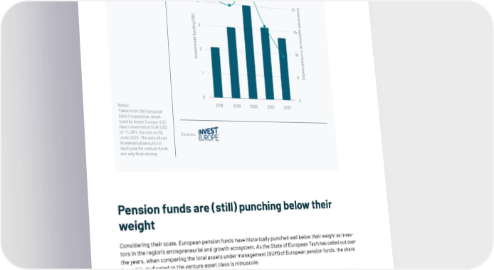 Government funding ($B) and share of government funding (%) per year, 2018 to 2022 Government funding ($B) Government agencies as 5 40 % of total funding G 4 32 o v e r n m ) e B n t $ ( a g g n 3 24 e i n d c n i u e f s t a n s e m % n o r 2 16 f e t v o o t G a l f u n d i n 1 8 g 0 0 Notes: 2018 2019 2020 2021 2022 Taken from the European Data Cooperative, devel- oped by Invest Europe. EDC data converted at EUR:USD of 1:1.0917, the rate on 30 Sources: June 2023. The data shows incremental amounts in each year for venture funds, not only final closing. Pension funds are (still) punching below their weight Considering their scale, European pension funds have historically punched well below their weight as inves- tors in the region’s entrepreneurial and growth ecosystem. As the State of European Tech has called out over the years, when comparing the total assets under management (AUM) of European pension funds, the share from this dedicated to the venture asset class is minuscule. In 2022, just 0.024% of pension fund AUM was invested into European VCs, in line with the average of the last 昀椀ve years. This is based on the reported assets of European pension funds, standing at $3.4 trillion. Adding in the assets managed in the United Kingdom would double these AUM and hence halve the share going to VC. Positively, there has been a small number of notable developments across Europe this year. The UK govern- ment, for example, added 昀氀exibility earlier this year on a fee cap previously limiting pension funds to invest in VC funds. Furthermore, in October, | 212