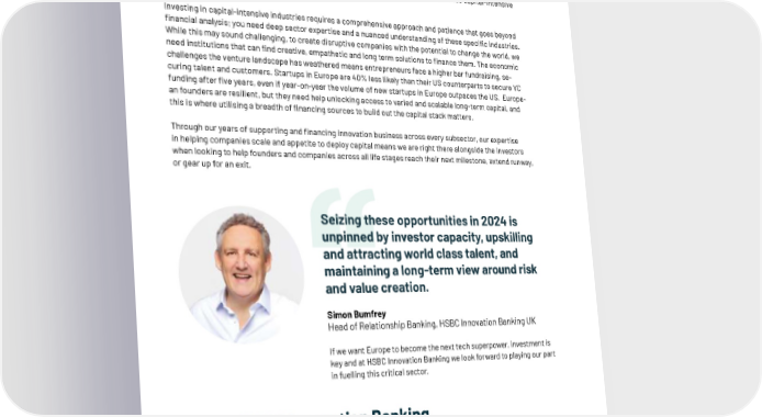 Founders in Europe have led in building purpose-driven tech, which has attracted an increase in funding at the growth stage that are setting out to solve some of our hardest problems. There is strong momentum in areas such as sustainability and climate, with ground-breaking developments in foundational technologies such as Generative AI with potential applications across almost every industry sub vertical. The Carbon & Energy sector which encompasses ‘climate tech’, accounts for 27% of all capital invested in European tech in 2023, tripling its share of investment since 2021. However, startups in sectors such as AI, climate, healthcare, education and infrastructure typically take a lot of money to scale. As a result, investors will need to revise their playbook to back these capital-intensive long-term businesses. Investing in capital-intensive industries requires a comprehensive approach and patience that goes beyond 昀椀nancial analysis; you need deep sector expertise and a nuanced understanding of these speci昀椀c industries. While this may sound challenging, to create disruptive companies with the potential to change the world, we need institutions that can 昀椀nd creative, empathetic and long term solutions to 昀椀nance them. The economic challenges the venture landscape has weathered means entrepreneurs face a higher bar fundraising, se- curing talent and customers. Startups in Europe are 40% less likely than their US counterparts to secure VC funding after 昀椀ve years, even if year-on-year the volume of new startups in Europe outpaces the US. Europe- an founders are resilient, but they need help unlocking access to varied and scalable long-term capital, and this is where utilising a breadth of 昀椀nancing sources to build out the capital stack matters. Through our years of supporting and 昀椀nancing innovation business across every subsector, our expertise in helping companies scale and appetite to deploy capital means we are right there alongside the investors when looking to help founders and companies across all life stages reach their next milestone, extend runway, or gear up for an exit. Seizing these opportunities in 2024 is unpinned by investor capacity, upskilling and attracting world class talent, and maintaining a long-term view around risk and value creation. Simon Bumfrey Head of Relationship Banking, HSBC Innovation Banking UK If we want Europe to become the next tech superpower, investment is key and at HSBC Innovation Banking we look forward to playing our part in fuelling this critical sector. About HSBC Innovation Banking HSBC Innovation Banking provides commercial banking services, expertise and insights to the technology, life science and healthcare, private equity and venture capital industries. HSBC Innovation Banking UK is a subsidiary of HSBC Group, bene昀椀ting from its stability, strong credit rating and international reach to help fuel its growth. | 14