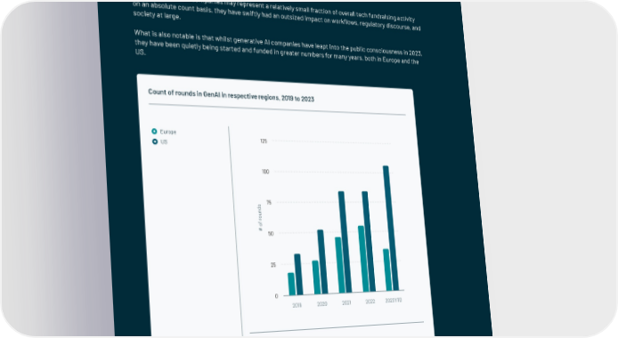 Generative AI sector rises in Europe’s tech scene The most remarkable subset within the AI space this year has undoubtedly been Generative AI. Generative AI companies focus on developing and applying arti昀椀cial intelligence technologies, particularly machine learning techniques, to generate new content, data, or media. This category features companies like Mistral AI and Aleph Alpha in Europe, alongside OpenAI (the makers of ChatGPT) and In昀氀ection AI in the United States. While Generative AI companies may represent a relatively small fraction of overall tech fundraising activity on an absolute count basis, they have swiftly had an outsized impact on work昀氀ows, regulatory discourse, and society at large. What is also notable is that whilst generative AI companies have leapt into the public consciousness in 2023, they have been quietly being started and funded in greater numbers for many years, both in Europe and the US. Count of rounds in GenAI in respective regions, 2019 to 2023 Europe US 125 100 s 75 d n u o r f o # 50 25 0 2019 2020 2021 2022 2023YTD Notes: Data is as of 30 September 2023. Sources: Excludes the following: biotech, secondary transactions, debt, lending capital, and grants. | 150