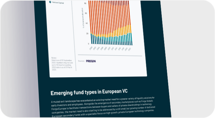 Share of AUM by alternative asset class based on manager HQ region, 2000 to 2023 Real Estate Private Equity 100 Private Debt Natural Resources Infrastructure 80 Venture Capital n o i t a c 60 o l l a t e s s a l a t o 40 t f o % 20 0 0 2 4 6 8 0 2 4 6 8 0 2 0 0 0 0 0 1 1 1 1 1 2 2 0 0 0 0 0 0 0 0 0 0 0 0 2 2 2 2 2 2 2 2 2 2 2 2 Notes: Data is as of 30 September Sources: 2023. Numbers may not add up to 100 due to rounding. 2023 data is as of 31 March 2023. Emerging fund types in European VC A muted exit landscape has exacerbated an existing market need for a greater variety of liquidity solutions for early investors and employees. Alongside the emergence of secondary marketplaces such as Forge Global’s Forge Europe to facilitate transactions between buyers and sellers of private shareholdings in technology companies, the market need is also starting to be addressed by a still small, but growing number of dedicated European secondary funds with a specialist focus on high-growth, private European technology companies. | 200