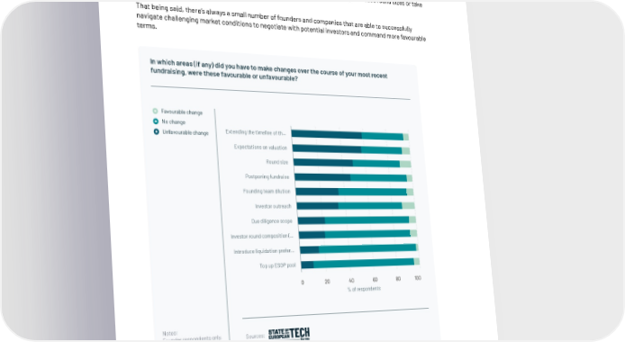 Founders having to adjust expectations In this year’s survey, we asked founders to share their speci昀椀c experiences in attempting to raise their most recent rounds of investment. The responses make for tough reading. The vast majority of founders highlighted the impact of challenging fundraising conditions on most aspects of their process. The most notable impacts cited were extended process timelines, the need to adjust valuation expectations down, and having to reduce round sizes or take more dilution than hoped. That being said, there’s always a small number of founders and companies that are able to successfully navigate challenging market conditions to negotiate with potential investors and command more favourable terms. In which areas (if any) did you have to make changes over the course of your most recent fundraising, were these favourable or unfavourable? Favourable change No change Unfavourable change Extending the timeline of th… Expectations on valuation Round size Postponing fundraise Founding team dilution Investor outreach Due diligence scope Investor round composition (… Introduce liquidation prefer… Top up ESOP pool 0 20 40 60 80 100 % of respondents Notes: Founder respondents only. Sources: Respondents who selected "No change / Not applica- ble" are excluded from the data. | 80