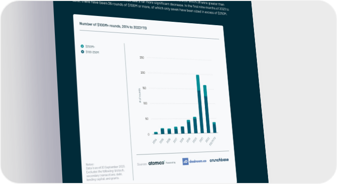 Mega-round momentum drops The combination of the withdrawal of crossover investors and the general slowdown in late-stage investment activity is unsurprisingly re昀氀ected in a huge decline in the number of so-called mega-rounds, meaning round sizes of $100M or more. In the peak of 2021, there were almost 200 rounds of this magnitude, including more than 50 rounds greater than $250M. While this number declined slightly in 2022 to 163 rounds of $100M or more (of which 38 were greater than $250M), the 昀椀rst nine months of 2023 saw a far more signi昀椀cant decrease. In the 昀椀rst nine months of 2023 to date, there have been 36 rounds of $100M or more, of which only seven have been sized in excess of $250M. Number of $100M+ rounds, 2014 to 2023YTD $250M+ $100-250M 250 200 s 150 d n u o r f o # 100 50 0 4 5 6 7 8 9 0 1 2 D 1 1 1 1 1 1 2 2 2 T 0 0 0 20 0 0 0 0 0 Y 2 2 2 2 2 2 2 2 3 2 0 2 Notes: Sources: Powered by Data is as of 30 September 2023. Excludes the following: biotech, secondary transactions, debt, lending capital, and grants. | 40