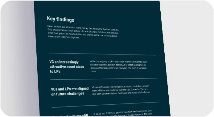 Key 昀椀ndings Here, we turn our attention to the money that keeps the 昀氀ywheel spinning. This chapter takes a look at how LPs and VCs have felt about the last year, what their priorities now look like, and examines the role of institutional investors in today’s ecosystem. While the majority of LPs reported an intention to maintain their VC an increasingly allocations across all asset classes, 35% stated an intention to attractive asset class increase their allocation to VC next year - the most of any asset class. to LPs VCs and LPs agree that navigating a tougher fundraising environ- VCs and LPs are aligned ment will be a real challenge over the next 12 months. They are on future challenges also both concerned about the impact of a muted exit landscape. In 2022, just 0.024% of pension fund AUM was invested into Euro- Pension funds are still pean VCs, in line with the average of the last 昀椀ve years. The scale punching bellowing of European pension funds means even a small increase in their share of AUM dedicated to VC would transform the ecosystem. their weight