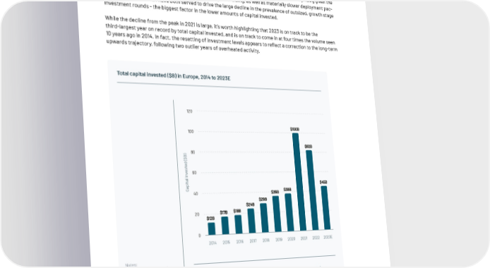 On track for $45B of capital invested in 2023 Total capital invested into the European tech ecosystem in 2023 is on track to reach around $45B, starkly highlighting the impact on capital 昀氀ows as a result of the shift in the broader macro landscape. This will be down more than half (55%) from the record year of 2021, when investment volumes surpassed the threshold of $100B for the 昀椀rst time. This also represents a steep drop-off of 38% from 2022’s total of $82B. The decline is not surprising given the dual effect of many later-stage companies delaying fundraising, as well as materially slower deployment pac- ing by investors, which have both served to drive the large decline in the prevalence of outsized, growth stage investment rounds - the biggest factor in the lower amounts of capital invested. While the decline from the peak in 2021 is large, it’s worth highlighting that 2023 is on track to be the third-largest year on record by total capital invested, and is on track to come in at four times the volume seen 10 years ago in 2014. In fact, the resetting of investment levels appears to re昀氀ect a correction to the long-term upwards trajectory, following two outlier years of overheated activity. Total capital invested ($B) in Europe, 2014 to 2023E 120 100 $100B $82B ) 80 B $ ( d e t s e 60 v n i l a t i $45B p a C 40 $36B $38B $29B $24B 20 $17B $18B $12B 0 2014 2015 2016 2017 2018 2019 2020 2021 2022 2023E Notes: Data is as of 30 September 2023. Full year extrapolated based on year to date data. Sources: Powered by Excludes the following: biotech, secondary transac- tions, debt, lending capital, and grants. 69 | Companies