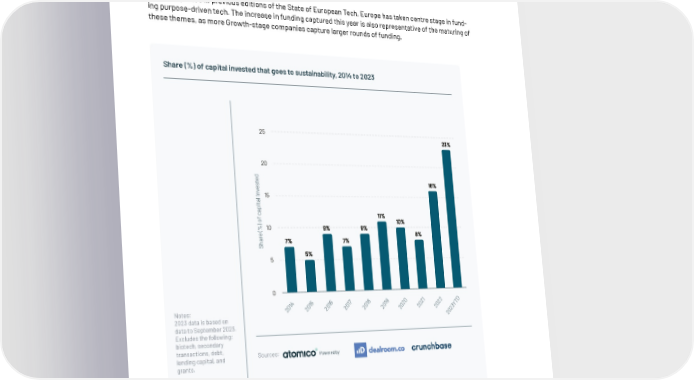Growth stage companies propel Europe’s climate tech funding Addressing sustainability and climate challenges have become core themes of the European tech ecosystem in recent years, increasing their share of total funding consistently over the past decade. This year’s report tracks all companies that label themselves as operating within one of the themes we categorise as directly addressing sustainability or climate, such as Electric Vehicles or Carbon Markets. As also reported in previous editions of the State of European Tech, Europe has taken centre stage in fund- ing purpose-driven tech. The increase in funding captured this year is also representative of the maturing of these themes, as more Growth-stage companies capture larger rounds of funding. Share (%) of capital invested that goes to sustainability, 2014 to 2023 25 23% 20 d e t 16% s e v n i15 l a t i p a c 11% f o 10% )10 % 9% 9% ( e 8% r a 7% 7% h S 5 5% 0 4 5 6 7 8 9 0 1 2 D 1 1 1 1 1 1 2 2 2 T 0 0 0 0 0 0 0 0 0 Y Notes: 2 2 2 2 2 2 2 2 2 3 2023 data is based on 02 data to September 2023. 2 Excludes the following: biotech, secondary transactions, debt, Sources: lending capital, and Powered by grants. 155 | Companies