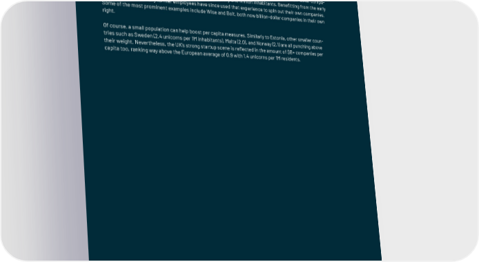 $B+ club per capita unchanged The emergence of billion-dollar companies is a simple but useful measure of startup success. It is also an in- dicator of a country’s ability to foster innovation and create a supportive environment for the development of high-growth startups and is therefore a way to benchmark progress, especially if normalised on a per capita basis to adjust for the different scale of country populations. On this measure, as it has done for years, Estonia continues to stand out as the leader in billion-dollar compa- ny density, with 4.5 companies valued at over $1B per every one million inhabitants. Bene昀椀tting from the early success of Skype, many former employees have since used that experience to spin out their own companies. Some of the most prominent examples include Wise and Bolt, both now billion-dollar companies in their own right. Of course, a small population can help boost per capita measures. Similarly to Estonia, other smaller coun- tries such as Sweden (2.4 unicorns per 1M inhabitants), Malta (2.0), and Norway (2.1) are all punching above their weight. Nevertheless, the UK’s strong startup scene is re昀氀ected in the amount of $B+ companies per capita too, ranking way above the European average of 0.9 with 1.4 unicorns per 1M residents. 123 | Companies