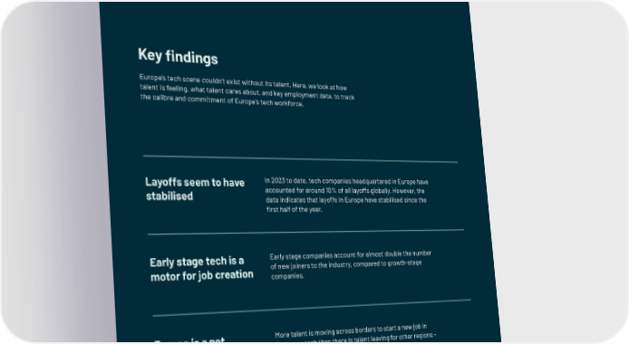 Key 昀椀ndings Europe’s tech scene couldn’t exist without its talent. Here, we look at how talent is feeling, what talent cares about, and key employment data, to track the calibre and commitment of Europe’s tech workforce. In 2023 to date, tech companies headquartered in Europe have Layoffs seem to have accounted for around 10% of all layoffs globally. However, the stabilised data indicates that layoffs in Europe have stabilised since the 昀椀rst half of the year. Early stage companies account for almost double the number Early stage tech is a of new joiners to the industry, compared to growth-stage motor for job creation companies. More talent is moving across borders to start a new job in Europe is a net European tech than there is talent leaving for other regions - bene昀椀ciary of global including the US. talent