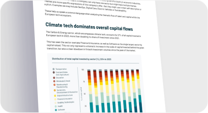Methodology note Creating a taxonomy is a hard task, and far from an exact science. However, we aim to 昀椀nd maximum align- ment between our taxonomy and the real problems companies are solving. The following chapter leverages a collection of models that map companies and startups to a taxonomy of 12 high-level sectors as well as 75+ building-block themes. More speci昀椀cally, sectors are where companies would 昀椀t in a description of a country’s economic industries, for example, Education or Health. A company can only have one sector but might have multiple themes. Themes are more speci昀椀c expressions of the company’s offer, that they might use in their self-description or a pitch. Examples we map include DevOps, Digital Care, Electric Vehicles or Sustainability. These help us speak a common language when analysing the thematic 昀氀ow of talent and capital within the European tech ecosystem. Climate tech dominates overall capital 昀氀ows The Carbon & Energy sector, which encompasses climate tech, accounts for 27% of all capital invested in European tech in 2023, more than doubling its share of investment since 2021. This has seen the sector overtake Finance & Insurance, as well as Software as the single largest sector by capital raised. This not only represents a dramatic increase in the scale of capital invested behind the green transition, but also a clear slowdown in 昀椀ntech investment volumes since the peak of the market. Distribution of total capital invested by sector (%), 2014 to 2023 Transportation 100 Food and Drinks (incl. Agriculture) Education Wholesale & Retail 75 Warehousing & Manufacturing l a t Social, Arts, i p Entertainment & Recreation a c l a 50 Digital Infrastructure t o t Finance & Insurance f o Enabling Technologies % Health 25 Software Carbon & Energy 0 4 5 6 17 8 9 0 1 2 D 1 1 1 0 1 1 2 2 2 T 0 0 0 2 0 0 0 0 0 Y 2 2 2 2 2 2 2 2 3 Notes: 2 0 Data is as of 30 September 2 2023. Excludes the following: biotech, secondary transac- tions, debt, lending capital, and grants. Sources: Powered by 131 | Companies