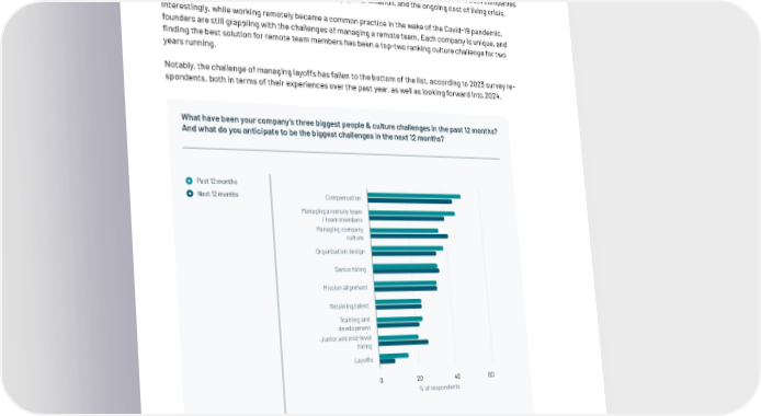 Compensation now on top of the agenda The changing macro environment has created a new set of challenges and priorities for European Tech talent. Hiring, both at the senior and junior level, is no longer a top-ranking challenge for founders, implying a cooling of the heated talent acquisition race witnessed in 2021 and 2022. In its place, for founders re昀氀ecting on the past year and looking at the next 12 months, the challenge of man- aging compensation now comes in 昀椀rst. This mirrors the current macroeconomic climate, as both companies and employees are feeling the pressure of managing spend, in昀氀ation, and the ongoing cost of living crisis. Interestingly, while working remotely became a common practice in the wake of the Covid-19 pandemic, founders are still grappling with the challenges of managing a remote team. Each company is unique, and 昀椀nding the best solution for remote team members has been a top-two ranking culture challenge for two years running. Notably, the challenge of managing layoffs has fallen to the bottom of the list, according to 2023 survey re- spondents, both in terms of their experiences over the past year, as well as looking forward into 2024. What have been your company’s three biggest people & culture challenges in the past 12 months? And what do you anticipate to be the biggest challenges in the next 12 months? Past 12 months Next 12 months Compensation Managing a remote team / team members Managing company culture Organisation design Senior hiring Mission alignment Retaining talent Training and development Junior and mid-level hiring Layoffs 0 20 40 60 % of respondents Notes: Numbers do not add to 100 as respondents could choose up to three options. Founder, Sources: C-level, and Department head respondents only. Respond- ents who selected "Other" are excluded from the data. 161 | Talent