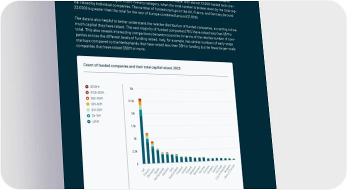 A reinforcing cycle One proxy for the relative scale of startup ecosystems across Europe is the absolute count of startups and scaleups that have received different levels of external capital investment. This does not, of course, tell the full story as there are many exceptional startups that choose never to raise any external funding, but it is still a useful measure of the relative depth and maturity of tech ecosystems across the region. Unsurprisingly, the countries that account for the largest absolute investment volumes are also the same ones with the highest count of funded companies. The UK is the leader with almost 13,000 funded tech com- panies in total and the largest count in every category, when the total number is broken down by the total cap- ital raised by individual companies. The number of funded startups in the UK, France, and Germany (around 23,000) is greater than the total for the rest of Europe combined (around 21,600). The data is also helpful to better understand the relative distribution of funded companies, according to how much capital they have raised. The vast majority of funded companies (76%) have raised less than $5M in total. This also reveals interesting comparisons between countries in terms of the relative number of com- panies across the different levels of funding raised. Italy, for example, has similar numbers of early-stage startups compared to the Netherlands that have raised less then $5M in funding, but far fewer larger-scale companies that have raised $50M or more. Count of funded companies and their total capital raised, 2023 $250M+ 15k $100-250M $50-100M 12.5k $20-50M $10-20M $5-10M 10k