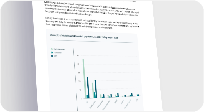 Closing the gap between European tech investment and GDP On a GDP-adjusted basis, Europe continues to lag behind in terms of its share of total capital invested globally in technology. Europe, as de昀椀ned by the 50 countries included in the State of European Tech report, accounts for 21% of global GDP. By comparison, the projected total of $45B of capital invested in the region will equate to around 18% of global investment volumes. By comparison, the US accounts for 25% of global GDP, but a massive 46% share of total capital invested. Looking at a sub-regional level, the UK & Ireland’s share of GDP and total global investment volumes are broadly aligned at around 4% each. Every other sub-region, however, records underperformance in terms of investment volumes if adjusted to their relative share of global GDP. The gap is particularly pronounced for Southern Europe and Central and Eastern Europe. Slicing the data on a per-country basis helps to identify the biggest opportunities to close the gap. In both Germany and Italy, for example, there is still a gap of more than two percentage points to catch up between their respective shares of global GDP and global private tech investment. Share (%) of global capital invested, population, and GDP (%) by region, 2023 Capital invested Population GDP 50 40 30 20 10 0 S e d x H s e E U p an lu C ic p E o l e A d o C r e n D r r u Ir e o u E B N E l & n ta K & r o U e e T c h Notes: n ut a o r S Data is as of 30 September F 2023. Full year extrapolated based on year to date data. Excludes the following: biotech, secondary transac- Sources: Powered by tions, debt, lending capital, and grants. Population and GDP data from International Monetary Fund. | 112