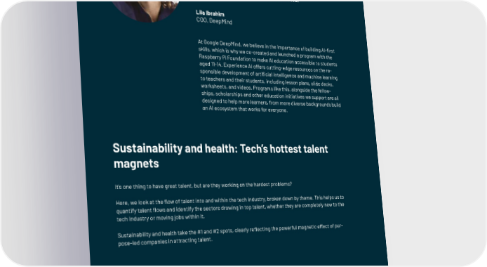 Europe is a hotbed for the kind of diversity needed to build the future of AI – and as an industry, we have a responsibility to continue to grow and nurture that talent. Lila Ibrahim COO, DeepMind At Google DeepMind, we believe in the importance of building AI-昀椀rst skills, which is why we co-created and launched a program with the Raspberry Pi Foundation to make AI education accessible to students aged 11-14. Experience AI offers cutting-edge resources on the re- sponsible development of arti昀椀cial intelligence and machine learning to teachers and their students, including lesson plans, slide decks, worksheets, and videos. Programs like this, alongside the fellow- ships, scholarships and other education initiatives we support are all designed to help more learners, from more diverse backgrounds build an AI ecosystem that works for everyone. Sustainability and health: Tech’s hottest talent magnets It’s one thing to have great talent, but are they working on the hardest problems? Here, we look at the 昀氀ow of talent into and within the tech industry, broken down by theme. This helps us to quantify talent 昀氀ows and identify the sectors drawing in top talent, whether they are completely new to the tech industry or moving jobs within it. Sustainability and health take the #1 and #2 spots, clearly re昀氀ecting the powerful magnetic effect of pur- pose-led companies in attracting talent. | 48