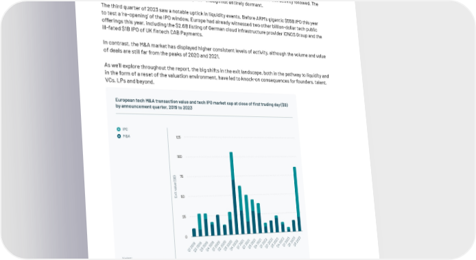 Exit landscape stirs after extended quiet period Liquidity events - or exits - are critical to the effective functioning of the European tech 昀氀ywheel - the virtu- ous cycle that powers the ecosystem. These serve not only as a means to unlock the realisation and redistri- bution of capital gains, but also as catalysts for the systematic recycling of talent and expertise into a new generation of companies. Following the peak of the market in Q4 2021, six consecutive quarters of subdued exit activity followed. The IPO landscape, in particular, was notably quiet - though not entirely dormant. The third quarter of 2023 saw a notable uptick in liquidity events. Before ARM’s gigantic $55B IPO this year to test a ‘re-opening’ of the IPO window, Europe had already witnessed two other billion-dollar tech public offerings this year, including the $2.6B listing of German cloud infrastructure provider IONOS Group and the ill-fated $1B IPO of UK 昀椀ntech CAB Payments. In contrast, the M&A market has displayed higher consistent levels of activity, although the volume and value of deals are still far from the peaks of 2020 and 2021. As we’ll explore throughout the report, the big shifts in the exit landscape, both in the pathway to liquidity and in the form of a reset of the valuation environment, have led to knock-on consequences for founders, talent, VCs, LPs and beyond. European tech M&A transaction value and tech IPO market cap at close of first trading day ($B) by announcement quarter, 2019 to 2023 IPO M&A 125 100 ) 75 B $ ( e u l a v t i x E 50 25 0 9 9 9 9 0 0 0 0 1 1 1 1 2 2 2 2 3 3 3 1 1 1 1 2 2 2 2 2 2 2 2 2 2 2 2 2 2 2 20 20 20 20 0 0 0 0 20 20 20 20 0 0 0 0 0 0 0 2 2 2 2 2 2 2 2 2 2 2 1 2 3 4 1 2 3 4 1 1 Q Q Q Q Q1 2 3 4 Q Q Q Q Q 2 3 4 Q 2 3 Notes: Q Q Q Q Q Q Q Q S&P Capital IQ Platform, as of date 30 September 2023, for illustrative purposes only. 2023 figures extrapolated linearly based on year to date figures. Sources: Includes announced and completed M&A transactions only (excluding since terminat- ed/withdrawn). 221 | Outcomes
