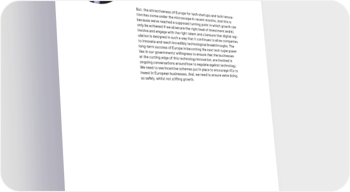 Europe has had a strong decade of growth, and it’s well on its way to competing with the US. Vishal Marria Founder & CEO, Quantexa But, the attractiveness of Europe for tech startups and tech innova- tion has come under the microscope in recent months. And this is because we’ve reached a supposed turning point in which growth can only be achieved if we a) secure the right level of investment and b) involve and engage with the right talent and c) ensure that digital reg- ulation is designed in such a way that it continues to allow companies to innovate and reach incredibly technological breakthroughs. The long-term success of Europe in becoming the next tech superpower lies in our governments’ willingness to ensure that the businesses at the cutting edge of this technology innovation, are involved in ongoing conversations around how to regulate against technology. We need to see incentive schemes put in place to encourage VCs to invest in European businesses. And, we need to ensure we’re doing so safely, whilst not sti昀氀ing growth. | 34