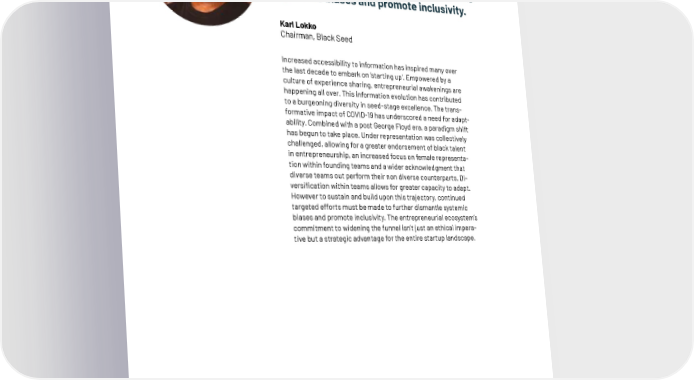 Diversi昀椀cation within teams allows for greater capacity to adapt. However to sustain and build upon this trajectory, continued targeted efforts must be made to further dismantle systemic biases and promote inclusivity. Karl Lokko Chairman, Black Seed Increased accessibility to information has inspired many over the last decade to embark on ‘starting up’. Empowered by a culture of experience sharing, entrepreneurial awakenings are happening all over. This information evolution has contributed to a burgeoning diversity in seed-stage excellence. The trans- formative impact of COVID-19 has underscored a need for adapt- ability. Combined with a post George Floyd era, a paradigm shift has begun to take place. Under representation was collectively challenged, allowing for a greater endorsement of black talent in entrepreneurship, an increased focus on female representa- tion within founding teams and a wider acknowledgment that diverse teams out perform their non diverse counterparts. Di- versi昀椀cation within teams allows for greater capacity to adapt. However to sustain and build upon this trajectory, continued targeted efforts must be made to further dismantle systemic biases and promote inclusivity. The entrepreneurial ecosystem’s commitment to widening the funnel isn’t just an ethical impera- tive but a strategic advantage for the entire startup landscape. 73 | Companies