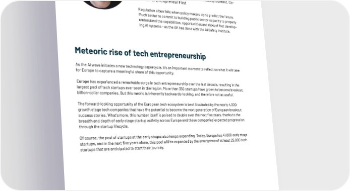 We need to take an empirical, research-driven approach to safety. Matt Clifford Prime Minister’s Representative for the AI Safety Summit, Co- founder of Entrepreneur First Regulation often fails when policy makers try to predict the future. Much better to commit to building public sector capacity to properly understand the capabilities, opportunities and risks of fast develop- ing AI systems - as the UK has done with the AI Safety Institute. Meteoric rise of tech entrepreneurship As the AI wave initiates a new technology supercycle, it’s an important moment to re昀氀ect on what it will take for Europe to capture a meaningful share of this opportunity. Europe has experienced a remarkable surge in tech entrepreneurship over the last decade, resulting in the largest pool of tech startups ever seen in the region. More than 350 startups have grown to become breakout, billion-dollar companies. But this metric is inherently backwards-looking, and therefore not as useful. The forward-looking opportunity of the European tech ecosystem is best illustrated by the nearly 4,000 growth stage tech companies that have the potential to become the next generation of European breakout success stories. What’s more, this number itself is poised to double over the next 昀椀ve years, thanks to the breadth and depth of early stage startup activity across Europe and these companies’ expected progression through the startup lifecycle. Of course, the pool of startups at the early stages also keeps expanding. Today, Europe has 41,000 early stage startups, and in the next 昀椀ve years alone, this pool will be expanded by the emergence of at least 25,000 tech startups that are anticipated to start their journey. 55 | Executive summary