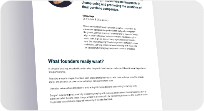 Apart from the necessary capital, founders of newer companies look at VCs who can commercially enable their growth. For example, VCs with a signi昀椀cant network in the founders’ target industries are invaluable in championing and promoting the solutions of their portfolio companies. Oana Jinga Co-Founder & CCO, Dexory This coupled with strategic guidance as well as concrete go-to- market and operational experience can really unlock exponen- tial growth. Last but foremost, founders tend to choose VCs who align to their companies’ vision but could be 昀氀exible enough to assist them in pivots should changing market conditions dic- tate. The key is choosing VCs who align with a company’s values and vision. A strong, collaborative relationship with VCs is vital for successfully managing the dynamic business landscape. What founders really want? In this year’s survey, we asked founders what they wish their investors had done differently since they entered into partnership. The asks are quite simple. Founders want a relationship that works, with close and more proactive engage- ment, and one built on clear communication, transparency and trust. They also value a shared mindset of embracing risk, being decisive and thinking in the long-term. Support in securing customers by proactively helping with business development also comes across as high on the wishlist. Beyond these things, access to a community for networking and mentorship, as well as secur- ing access to capital also featured frequently in founder feedback. 101 | Companies