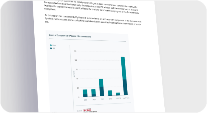 Taking the longer-term view Despite almost two full years of quiet on the exit front, it’s worth taking a longer-term perspective on the state of Europe’s ability to produce large-scale companies that succeed in going from founding to a billion-dollar liquidity event. In the past 昀椀ve years alone, there have been a remarkable 111 billion-dollar exits of European tech companies, the majority of which (60%) have been realised via M&A. While reaching $B+ outcomes via initial public listings has been somewhat less common than via M&A for European tech companies historically, the reopening of the IPO window and the development of deep and liquid public capital markets is a critical factor for the long-term health and progress of the European tech ecosystem. As this report has consistently highlighted, outsized exits are an important component of the European tech 昀氀ywheel, with success stories unlocking capital and talent as well as inspiring the next generation of found- ers. Count of European $B+ IPOs and M&A transactions M&A IPO 125 100 s 75 t i x e f o # 50 25 0 2019 2020 2021 2022 2023YTD Last 5 Years Notes: Sources: S&P Capital IQ Platform, as of date 30 September 2023, for illustrative purposes only. 243 | Outcomes