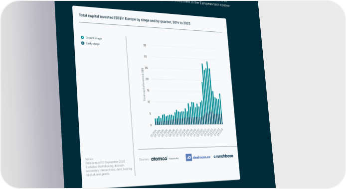 Beyond the slowdown, a funding equilibrium The decrease in investment since 2021 is mainly due to a slowdown in growth stages. However, after a sharp drop right after the peak, there has been a stable total investment volume for the past 昀椀ve quarters. Two important things to note are: Firstly, early stage investment has stayed stable despite the ups and downs in investment volume in 2021. Secondly, if we exclude the overheated 18-month period from Q1 2021 to Q2 2022, we get a clearer view of the consistent long-term growth in investment in the European tech ecosys- tem. Total capital invested ($B) in Europe by stage and by quarter, 2014 to 2023 Growth stage Early stage 35 30 ) 25 B $ ( d e t s 20 e v n i l a t i p 15 a c l a t o T 10 5 0 4 4 5 5 6 6 7 7 8 8 9 9 0 0 1 1 2 2 3 3 1 1 1 1 1 1 1 1 1 1 1 1 2 2 2 2 2 2 2 2 0 0 0 0 0 0 0 0 0 0 0 0 0 0 0 0 0 0 0 0 2 2 2 2 2 2 2 2 2 2 2 2 2 2 2 2 2 2 2 2 1 3 1 3 1 3 1 3 1 3 1 3 1 3 Q Q Q Q Q Q Q Q Q Q Q Q Q1 Q3 Q Q Q1 Q3 Q1 Q3 Notes: Sources: Data is as of 30 September 2023. Powered by Excludes the following: biotech, secondary transactions, debt, lending capital, and grants. 39 | Executive summary