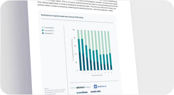 As startups mature, top teams draw majority of capital The concentration of capital around companies that succeed in building outlier teams is also evidenced when looking at the distribution of capital raised over time. In the initial two years post-founding, before most companies have really had an opportunity to signi昀椀cantly strengthen their teams, capital is distributed more widely. As time elapses, however, more and more capital 昀氀ows to the strongest teams. This is, of course, aided by the fact that there is a compounding positive effect from raising capital when it comes to building an exceptional team. The more you raise, the stronger your position when it comes to attracting, retaining and rewarding the best - and most expensive - talent. Distribution of capital raised over time by STAR rating Exceptional (5+) 100 Very good (3-4) Standard (0-2) 80 g n i t a r R A T 60 S y b d e s i a r l a 40 t i p a c f o % 20 0 1 2 3 4 5 6 7 8 9 10 Years post founding Notes: Sources: Powered by An “exceptional” team has a rating of 5 and above. Data is as of 20 September 2023. | 186