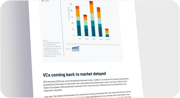 Number of VC funds raised, 2019 to H1 2023 > €500M €250 - 500M 175 €100 - 250M €50 - 100M 150 €25 - 50M < €25M 125 d e s i a r100 s d n u f C V 75 f o # 50 25 0 2019 2020 2021 2022 H1 2023 Notes: H1 2023 figures are prelimi- nary. Taken from the European Data Cooperative, developed by Invest Europe. Sources: EDC data converted at EUR:USD of 1:1.0917, the rate on 30 June 2023. Data is final closing only. VCs coming back to market delayed 2021 and early 2022 saw record-breaking investment levels, fuelled in no small part by investors signi昀椀cantly accelerating their pace of investment and compressing fund deployment cycles. Last year’s edition of the State of European Tech predicted a reversal of this trend starting in 2023 and this is now beginning to be re昀氀ected in the data. Last year, the median time between VCs returning to market and closing their next funds had shrunk to record lows in both Europe and the US. In the US, this number had fallen as low as a median fund cycle length of just 1.5 years, a remarkable divergence from the long-run US average of 2.7 years. In Europe, meanwhile, this num- ber fell to a new low of 2.7 years in 2022, compared to the long-term average of 3.2 years. This year, however, shows that the time between funds in the US has started to elongate again, extending to two years, while in Europe the numbers appear to be delayed in re昀氀ecting the impact and have yet to increase as visibly as in the US. That said, the data does show indications of fund cycles having now settled above a median of 2.5 years. | 202