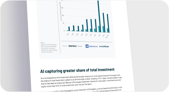 Total capital invested ($B) in AI / ML in Europe and US, 2014 to 2023 Europe US 50 40 ) B $ ( d e t s 30 e v n i l a t i p a c f 20 o n u o m A 10 0 4 15 6 17 8 9 0 1 2 D 1 0 1 0 1 1 2 2 2 T 0 2 0 2 0 0 0 0 0 Y 2 2 2 2 2 2 2 3 2 0 2 Notes: Data is as of 30 September Sources: Powered by 2023. Excludes the follow- ing: biotech, secondary transactions, debt, lending capital, and grants. AI capturing greater share of total investment As a consequence of AI investment defying the broader downturn in total capital invested in European tech, AI’s share of total investment spiked to an all-time high in 2023, climbing to 17%. Again, the data makes it clear that AI has been an important feature of European investment themes for many years, consistently account- ing for more than 10% of total investment over the last 昀椀ve years. What is also notable is that the gigantic sums invested in US AI leaders, such as OpenAI and Anthropic, in the last two years has resulted in a widened gap between Europe and the US’s relative share of investment in AI in 2023. In the US, AI investment accounted for 30% of total tech investment, almost double the level seen in previous years. | 142
