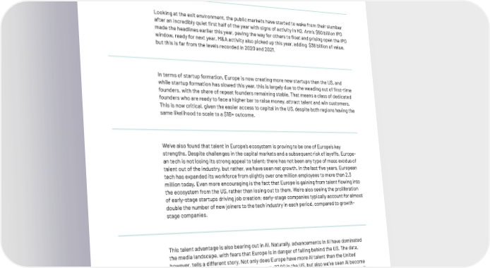 And yet, this year European tech has proven its resilience and shown signs of stabilisation. De- spite this tough macro environment, the ecosystem has bounced back to a value of $3 trillion, recovering the $400 billion that was wiped out last year; the layoffs that plagued 2022 have peaked and levelled off, with the worst of them seemingly behind us; Europe’s overall funding levels, while experiencing the same pullback being felt across the globe, is still the third high- est on record at $45B, indicating that the ecosystem remains resilient, and is correcting itself following the highs of 2021 and early 2022. Looking at the exit environment, the public markets have started to wake from their slumber after an incredibly quiet 昀椀rst half of the year with signs of activity in H2. Arm’s $50 billion IPO made the headlines earlier this year, paving the way for others to 昀氀oat and prising open the IPO window, ready for next year. M&A activity also picked up this year, adding $36 billion of value, but this is far from the levels recorded in 2020 and 2021. In terms of startup formation, Europe is now creating more new startups than the US, and while startup formation has slowed this year, this is largely due to the weeding out of 昀椀rst-time founders, with the share of repeat founders remaining stable. That means a class of dedicated founders who are ready to face a higher bar to raise money, attract talent and win customers. This is now critical, given the easier access to capital in the US, despite both regions having the same likelihood to scale to a $1B+ outcome. We’ve also found that talent in Europe’s ecosystem is proving to be one of Europe’s key strengths. Despite challenges in the capital markets and a subsequent risk of layoffs, Europe- an tech is not losing its strong appeal to talent; there has not been any type of mass exodus of talent out of the industry, but rather, we have seen net growth. In the last 昀椀ve years, European tech has expanded its workforce from slightly over one million employees to more than 2.3 million today. Even more encouraging is the fact that Europe is gaining from talent 昀氀owing into the ecosystem from the US, rather than losing out to them. We’re also seeing the proliferation of early-stage startups driving job creation; early-stage companies typically account for almost double the number of new joiners to the tech industry in each period, compared to growth- stage companies. This talent advantage is also bearing out in AI. Naturally, advancements in AI have dominated the media landscape, with fears that Europe is in danger of falling behind the US. The data, however, tells a different story. Not only does Europe have more AI talent than the United States, with 108,000 AI operators in Europe vs. 87,00 in the US, but also we’ve seen AI become the number one theme at Seed stage, including Mistral AI securing the largest seed round in Eu- ropean history. AI-focused companies made up 22% of all European megarounds this year, even surpassing the levels in 2022, indicating that investors’ appetite to fund the sector remains strong despite the macro turbulence. This achievement is especially impressive when com- pared with the trend in the US, where the availability of growth-stage capital has a substantial impact on the number of $100M+ rounds raised. | 8