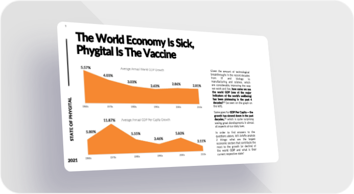 9 The World Economy Is Sick, Phygital Is The Vaccine 5.57% Average Annual World GDP Growth Given the amount of technological breakthroughs in the recent decades 4.03% from IT and biology to 3.03% manufacturing and science, which 2.63% 2.86% 2.81% are considerably improving the way weworkandlive, how come we see the world GDP (one of the major indicators of the world’s wellbeing) has been plateauing in the past 4 AL decades?[4] (as seen on the graph on 1960s 1970s 1980s 1990s 2000s 2010s the left). SamegoesforGDPPerCapita—the growth has slowed down in the past [5] 11.87% Average Annual GDP Per Capita Growth decades, which is quite surprising OF PHYGIT seeing great developments in almost E all aspects of our daily lives. AT 5.80% 5.55% 5.83% In order to find answers to the questions above, let’s briefly analyze ST 3.46% 2.11% 2 things: what are the largest economic sectors that contribute the most to the growth (or decline) of the world GDP and what is their 2021 1960s 1970s 1980s 1990s 2000s 2010s current respective state?