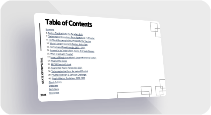 4 Table of Contents Foreword 6. Factors That Facilitate The Paradigm Shift 7. Technological Revolutions: From Agricultural To Phygital 9. The World Economy Is Sick, Phygital Is The Vaccine 10. World’s Largest Economic Sectors Status Quo 12. Technological Breakthroughs 1970 – 2021 14. Internet In Its Today’s Form Harms And Spoils Masses 15. What Is (actually) Phygital? AL 17. Impact of Phygital on World’s Largest Economic Sectors 19. Phygital Use Cases 36. AR/VR Patents Outlook 37. Augmented Reality Penetration 2021 OF PHYGIT38. Technologies that form the basis of Phygital E 39. Phygital Hardware & Software Challenges AT 40. Phygital Market Predictions 2021-2022 About Authors ST Disclaimer Definitions 2021 References