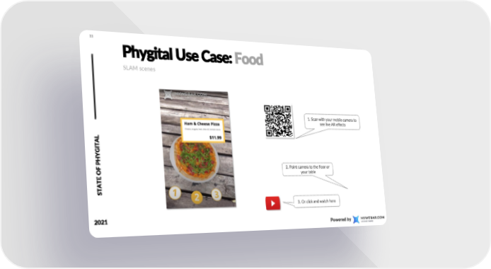 State of Phygital Page 32 Page 3433 PhygitalUse Case:Food SLAM scenes 1. Scan with your mobile camera to see live AR effects AL OF PHYGIT 2. Point camera to the floor or E your table AT ST 3. Or click and watch here 2021 Poweredby