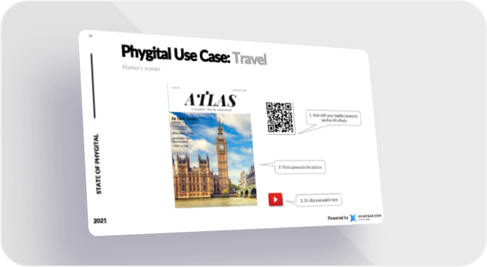 State of Phygital Page 27 Page 2928 PhygitalUse Case: Travel Marker’s scenes 1. Scan with your mobile camera to see live AR effects AL OF PHYGIT 2. Point camera to the picture E AT ST 3. Or click and watch here 2021 PPoweowerreedd byby