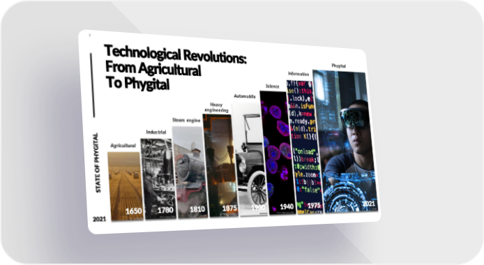 7 Technological Revolutions: Phygital From Agricultural Information To Phygital Science Automobile Heavy engineering Steam engine AL Industrial Agricultural OF PHYGITE AT ST 1650 1780 2021 Photo by Cosmin Serban on Unsplash 1810 1875 1900 1940 1975 2021 2021 Photo by Mihály Köles Photo by Museums Victoria Photo by Sherry Chen Photo by Ant Rozetsky Source of photo Photo by National Cancer Institute Photo by Markus Spiske Eon Reality