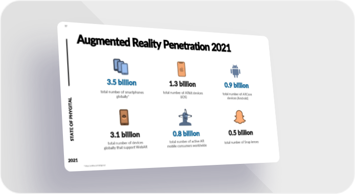 37 Augmented Reality Penetration 2021 3.5 billion 1.3 billion 0.9 billion total number of smartphones total number of ARkit devices total number of ARCore globally* (iOS) devices (Android) AL OF PHYGITE AT 3.1 billion 0.8 billion 0.5 billion ST total number of devices total number of active AR total number of Snap lenses globally that support WebAR mobile consumers worldwide 2021 * https://artillry.co/intelligence/