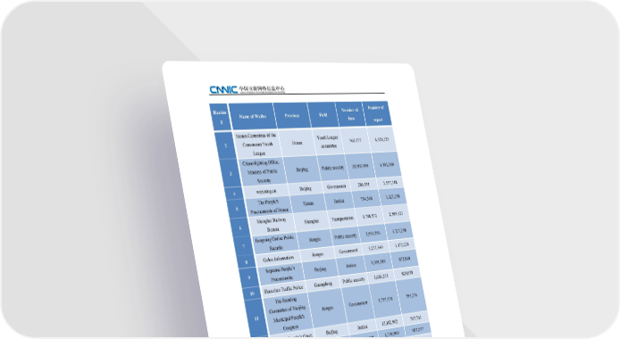 Number of Rankin Number of Name of Weibo Province Field g fans repost Henan Committee of the Youth League 2 Communist Youth Henan 965,377 4,528,125 committee League Crime-fighting Office, 3 Ministry of Public Beijing Public security 29,903,999 4,301,360 Security 4 wenming.cn Beijing Government 286,551 3,557,348 The People's 5 Henan Justice 754,548 3,123,158 Procuratorate of Henan Shanghai Railway 6 Shanghai Transportation 1,708,572 2,505,123 Bureau Jiangning Online Public 7 Jiangsu Public security 1,954,956 1,227,298 Security 8 Gulou Information Jiangsu Government 5,233,540 1,172,224 Supreme People’s 9 Beijing Justice 9,309,589 872,848 Procuratorate 10 Shenzhen Traffic Police Guangdong Public security 1,626,231 828,038 The Standing Committee of Nanjing 11 Jiangsu Government 1,797,538 795,274 Municipal People's Congress 12 Supreme People’s Court Beijing Justice 15,182,902 747,703 13 Clean Zhengzhou Henan Government 1,770,900 693,537 14 Safe Beijing Beijing Public security 11,945,870 687,509 China Quick Reporting 15 Beijing Government 5,572,206 658,132 Network for Earthquake Shandong Provincial 16 Shandong Justice 1,611,759 646,742 Supreme People's Court Children missing information release 17 Beijing Public security 440,873 619,882 platform of Ministry of Public Security 18 Chengdu Release Sichuan Government 6,292,304 619,308 19 Longnan Release Gansu Government 151,298 615,085 20 Clean Central China Henan Government 2,928,526 614,169 96 Source: Sina Weibo The 39th Statistical Report on Internet Development in China