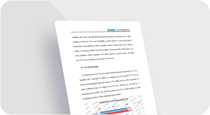 obtaining online music copyright through investment, acquisition of copyright owner or direct purchase are on the rise. Next, users' affordability is greatly enhanced. As the business model of online music groups utilizing exclusive copyright resources to attract users to pay is growing mature, an increasing number of users start to approve the payment mode of online music. Last, online platforms conduct cooperation with Internet operators to provide multiple value-added services for users, expanding revenue modes of online music. 5.5 Live broadcasting 20 Live streaming services , driven by capital, achieved sustained development in 2016. Up to December 2016, China had 344 million live streaming users who accounted for 47.1% of all netizens and represented a half-year increase of 19.32 million from June 2016. Specifically, live game broadcasting enjoys the biggest rise in the users’ utilization ratio, increasing by 3.5 percentage points in half a year while the utilization ratio of live concert streaming, live sport broadcasting and host live show maintaining relative stability. Utilization Ratio of Live Broadcasting in 2016 0% 10% 20% 30% Live sport 20.1% broadcasting 20.7% 16.5% Game streaming 20.0% 19.2% Host live show 19.8% Live concert 13.3% streaming 15.1% 2016.6 2016.12 Source: Statistical Survey on Internet Development in China 2016.12 Figure 65 Utilization Ratio of Live Broadcasting in 2016 In 2016, the industrial disorder arising from the high-speed development was effectively combated under tighter supervision over the content of live game streaming and host live show, as well as related policies and crackdown operations. In April 2016, the Ministry of Culture 20 Live streaming services surveyed for this report include live sport broadcasting, host live show, live game streaming, and live concert streaming. 7979 The 39th Statistical Report on Internet Development in China