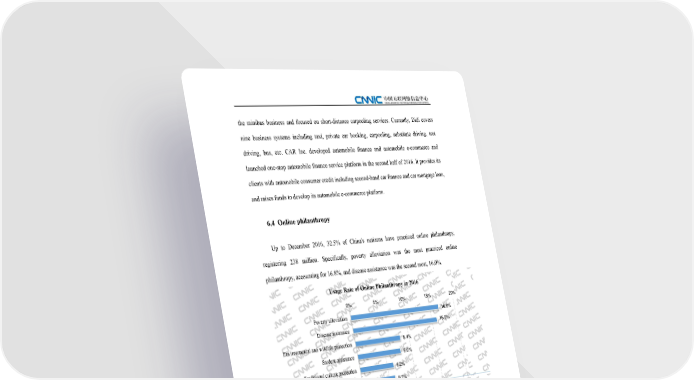 the minibus business and focused on short-distance carpooling services. Currently, Didi covers nine business systems including taxi, private car booking, carpooling, substitute driving, test driving, bus, etc. CAR Inc. developed automobile finance and automobile e-commerce and launched one-stop automobile finance service platform in the second half of 2016. It provides its clients with automobile consumer credit including second-hand car finance and car mortgage loan, and raises funds to develop its automobile e-commerce platform. 6.4 Online philanthropy Up to December 2016, 32.5% of China's netizens have practiced online philanthropy, registering 238 million. Specifically, poverty alleviation was the most practiced online philanthropy, accounting for 16.8%, and disease assistance was the second most, 16.0%. Usage Rate of Online Philanthropy in 2016 0% 5% 10% 15% 20% Poverty alleviation 16.8% 16.0% Disease assistance Environmental and wildlife protection 8.4% Student assistance 8.0% Traditional culture protection 6.2% Relief of the disabled 6.1% Source: Statistical Survey on Internet Development in China 2016.12 Figure 70 Usage Rate of Online Philanthropy in 2016 Since 2016, the rapid development of the Internet has radically changed related industries. Through innovation, China’s public charity has prompted more people to participate in poverty alleviation, disease assistance and relief of the disabled by utilizing online charity platforms. New Internet-based models for public welfare include donation, crowdfunding and social network fundraising, making charitable donations more transparent, convenient and diversified. The new operating model of the “Internet +” charity is shown in the following three features: First, it promotes the gradual development of a social atmosphere, where “everyone supports charity”. The new model of online philanthropy not only enables the public to make charitable 8585 The 39th Statistical Report on Internet Development in China