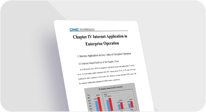 Chapter IV Internet Application in Enterprise Operation I. Internet Application in Key Links of Enterprise Operation (I) Internet-Based Reform of the Supply Chain As of December 2016, 60.0% of companies with Internet access had deployed the IT system, up by 13.4 percentage points compared with 2015. Among them, 50.4%, 28.2% and 25.9% had installed the office automation (OA) system, the enterprise resource planning (ERP) system and the customer relationship management (CRM) system, respectively. IT System Construction in Companies 70% 60.0% 60% Where: 46.6% 44.8% 50.4% 50% 40% 28.2% 30% 22.0% 25.9% 20% 18.6% 10% 0% applying IT system OA ERP CRM 2015 2016 Sourceļ¼ Statistical Survey on Internet Application in Chinese Enterprises 2016.12 Figure 14 IT System Construction in Companies The enterprises that carried out online sales accounted for 45.3% of the national total up to December 2016. During the 12th Five-Year Plan period, e-commerce market developed rapidly, quadrupling its turnover. The year of 2016 is the first year of the 13th Five-Year Plan. E-commerce market remains robust, enterprise engagement continues to deepen, and the proportion of enterprises engaged in online sales rise substantially. 22 The 39th Statistical Report on Internet Development in China