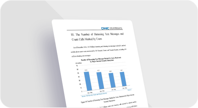 III. The Number of Harassing Text Messages and Crank Calls Marked by Users As of December 2016, 18.38 billion harassing and cheating text messages marked by android mobile phone users were monitored by 360 Security Center and Tencent Security, including 610 million cheating text messages. Number of Harassing Text Messages Marked by Users, Monitored by Major Internet Security Enterprises 100million 70 60 51.8 50 47.7 42.2 42.1 40 30 20 10 0 Jan.–Mar. Apr.–Jun. Jul.–Sep. Oct.–Dec. Source: 360 Security Center and Tencent Security 2016.12 Figure 84 Number of Harassing Text Messages Marked by Users, Monitored by Major Internet Security Enterprises Up to December 2016, 39.12 billion crank and cheating calls marked by android mobile phone users were monitored by 360 Security Center and Tencent Security, including 4.89 billion cheating calls. The 39th Statistical Report on Internet Development in China 109109