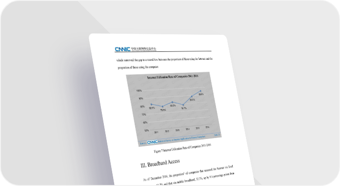 which narrowed the gap to a record low between the proportion of those using the Internet and the proportion of those using the computer. Internet Utilization Rate of Companies 2011-2016 100% 90% 95.6% 89.0% 80% 82.1% 83.2% 78.5% 78.7% 70% 60% 50% 2011 2012 2013 2014 2015 2016 Sourceļ¼ Statistical Survey on Internet Application in Chinese Enterprises 2016.12 Figure 7 Internet Utilization Rate of Companies 2011-2016 III. Broadband Access 9 As of December 2016, the proportion of companies that accessed the Internet via fixed broadband was 93.7% and that via mobile broadband, 32.3%, up by 8.4 percentage points from 2015. 9 The utilization ratios of the Internet access ways released in this survey refer to the proportion of enterprises 16 which access the Internet in various ways among all the interviewed enterprises. The 39th Statistical Report on Internet Development in China