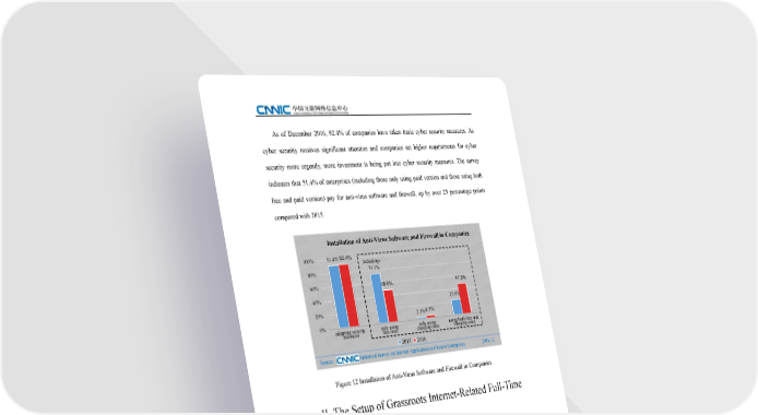 As of December 2016, 92.4% of companies have taken basic cyber security measures. As cyber security receives significant attention and companies set higher requirements for cyber security more urgently, more investment is being put into cyber security measures. The survey indicates that 51.4% of enterprises (including those only using paid version and those using both free and paid version) pay for anti-virus software and firewall, up by over 25 percentage points compared with 2015. Installation of Anti-Virus Software and Firewall in Companies 92.4% 100% 91.4% including: 74.1% 80% 60% 48.6% 47.3% 40% 23.6% 20% 4.1% 2.3% 0% adopting security only using only using using both free and measures free ones charging ones charging ones 2015 2016 Source: Statistical Survey on Internet Application in Chinese Enterprises 2016.12 Figure 12 Installation of Anti-Virus Software and Firewall in Companies II. The Setup of Grassroots Internet-Related Full-Time Posts As of the end of 2016, 42.4% of companies set up Internet-related full-time posts at the grassroots level, significantly rising compared with the 2015 level of 34.0%. More than 50% of enterprises with a staff number of 100 and above set up the full-time posts, showing an obvious increase; little change was shown in the proportion of small and micro enterprises with a staff number of 50 and below setting up the posts compared with 2015. 20 The 39th Statistical Report on Internet Development in China
